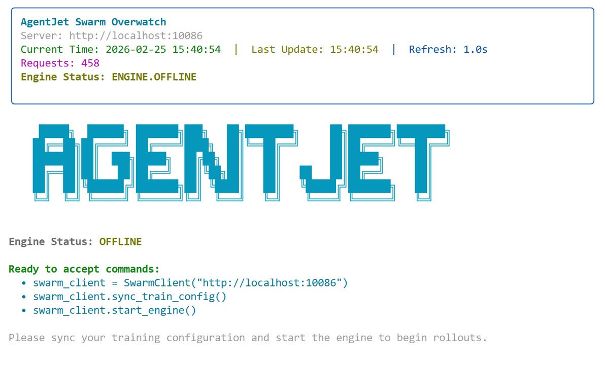 bash -c "(ajet-swarm overwatch) & (NO_COLOR=1 LOGURU_COLORIZE=NO ajet-swarm start &>/workspace/log/swarm_server.log)"And when completed, you will see a interface like this, which means the deployment is successful: