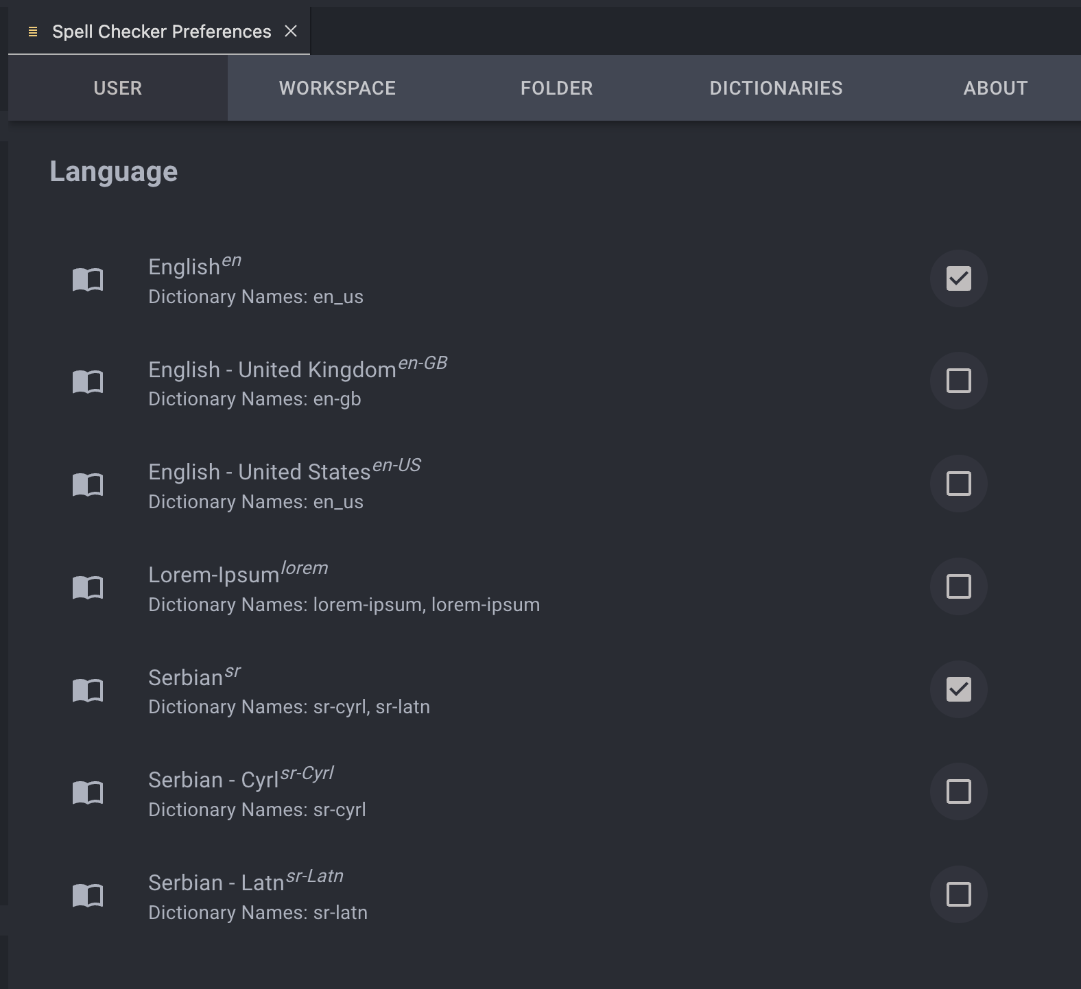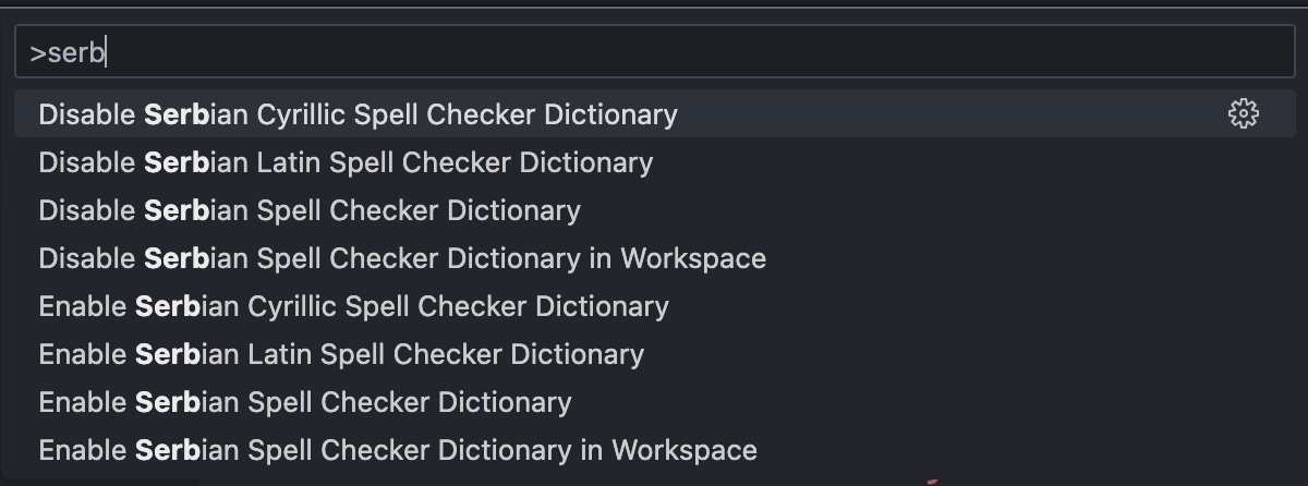 Enable Serbian Spell Checker DictionaryDisable Serbian Spell Checker DictionaryEnable Serbian Cyrillic Spell Checker DictionaryDisable Serbian Cyrillic Spell Checker DictionaryEnable Serbian Latin Spell Checker DictionaryDisable Serbian Latin Spell Checker DictionaryEnable Serbian Spell Checker Dictionary in WorkspaceDisable Serbian Spell Checker Dictionary in Workspace